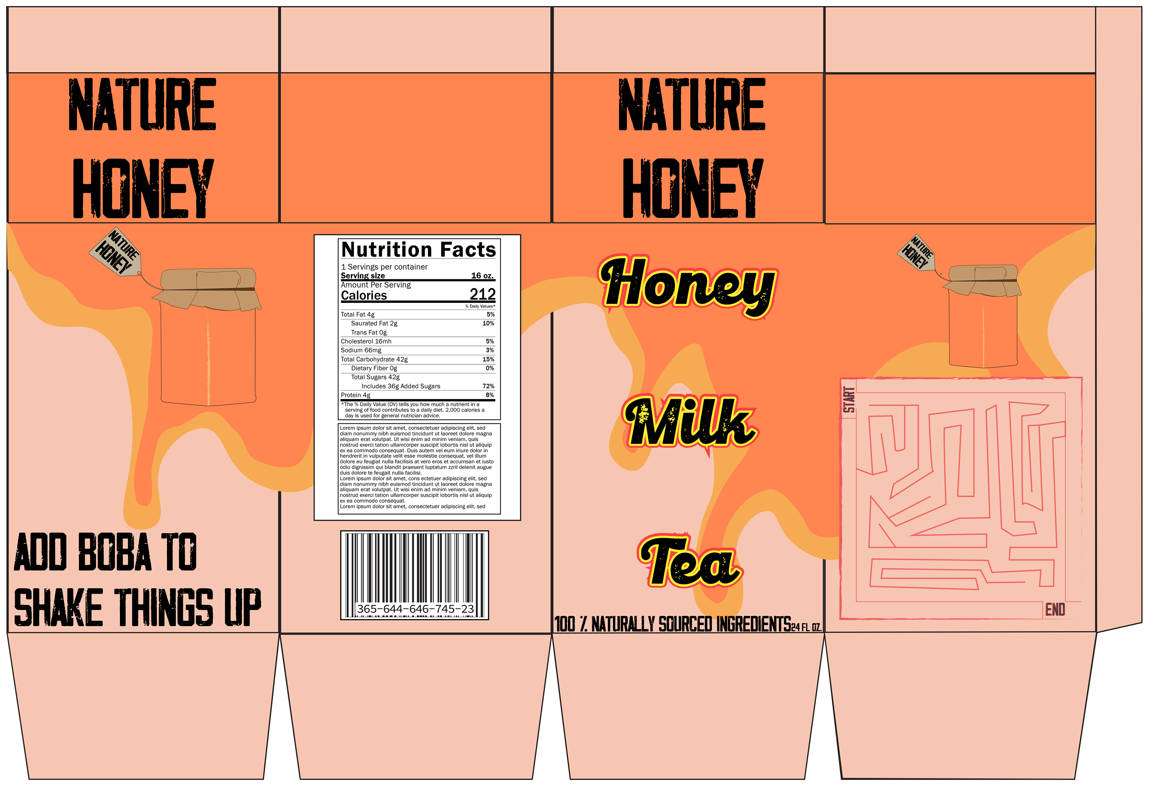 For this project I was tasked with creating a fake company and drink product, then to design a carton package for said product. I chose Honey Milk Tea sold by Nature Honey.