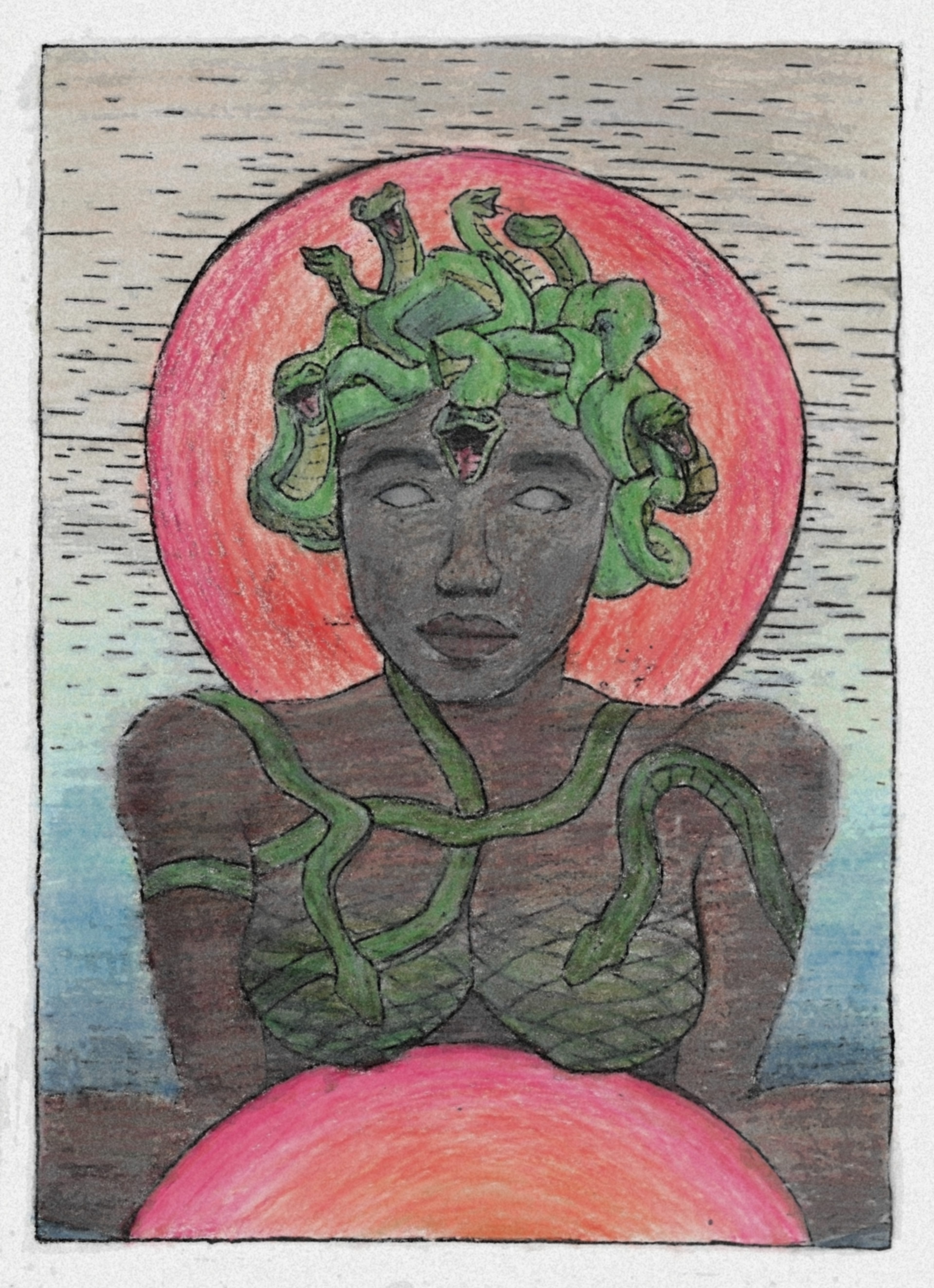 For my art class, I had the opportunity to work with printmaking. I etched the outline of this image of Medusa, printed it with black ink onto watercolor paper, and colored it in with pencils.